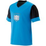 100% polyester wicking knit * Wicks moisture away from the body * Pad print label * Self-fabric V-neck collar * Set-in sleeves * Contrast-color sleeve and collar * Double-needle hemmed sleeves and bottom
